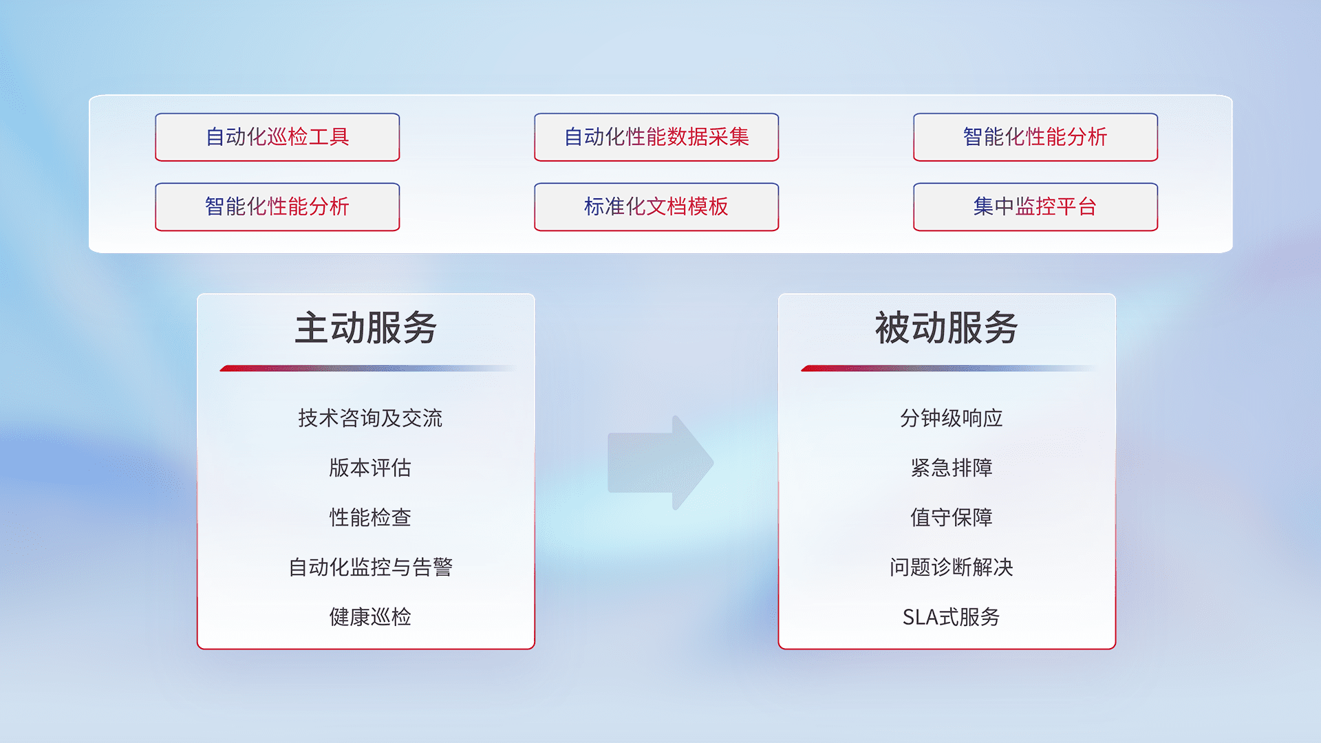 智能化工具和标准化文档,,,保障服务质量,,提供主动服务(包含技术咨询、、、、版本评估、、、性能检查、、、、自动化监控与告警、、健康巡检)和被动服务包含(分钟级响应、、紧急排障、、值守保障、、、问题诊断解决、、、、SLA服务)。。